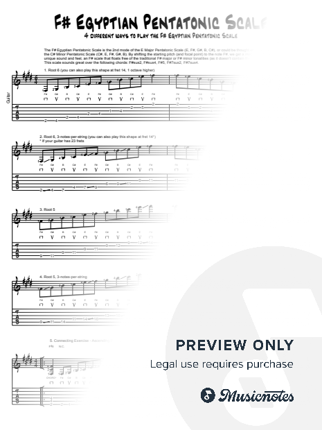 This sheet shows guitarists 4 ways to play the F# Egyptian Pentatonic Scale: