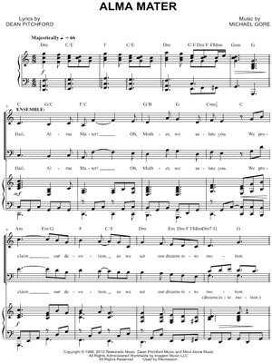 Lyrics begin: "Hail, Alma Mater! Oh, Mother, we salute you."