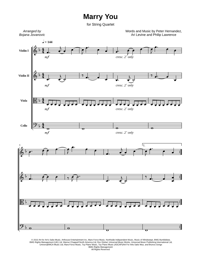 Violin 1, range: G3-Bb5 Violin 2, range: Bb3-D6 Viola, range: C3-Bb4 Cello, range: F2-Bb3 | |
