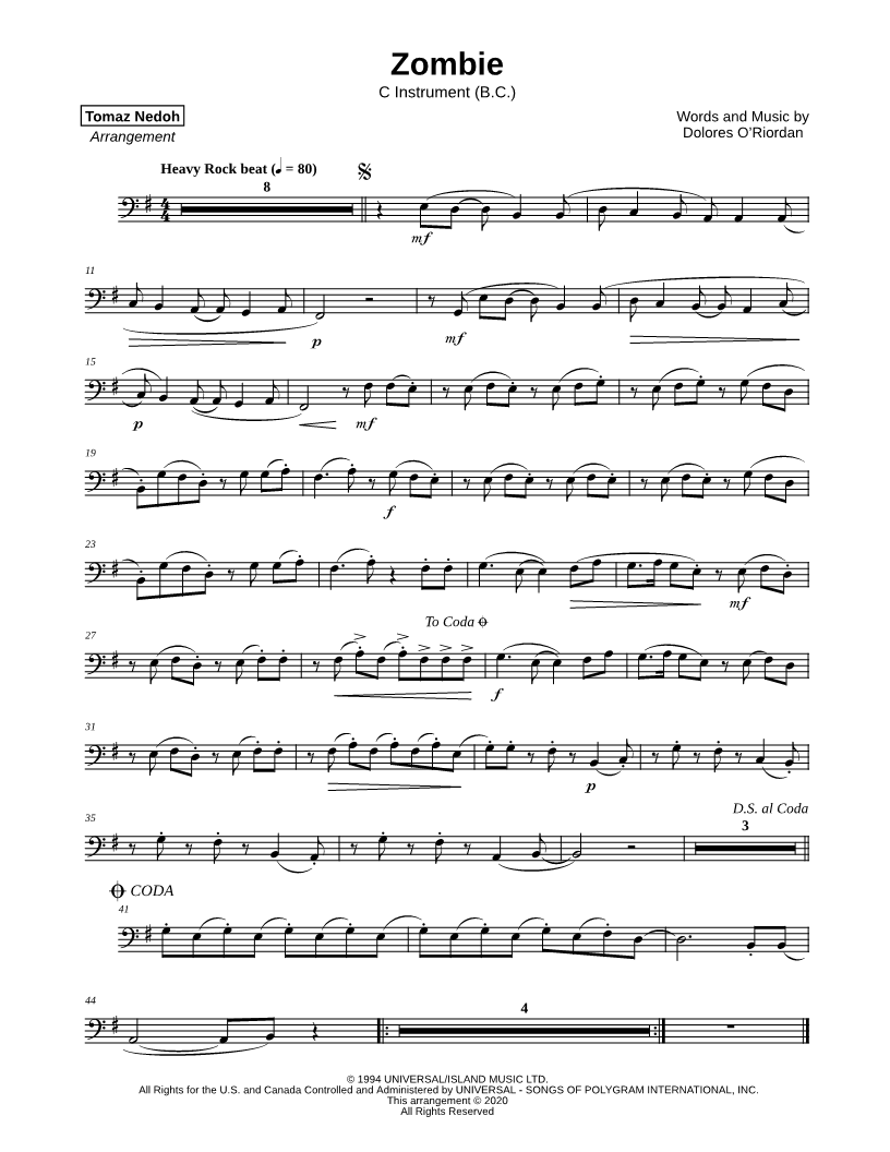 1. Zombie - Bass Clef Instrument (click here to preview and play this piece) Performers: Composer: Lyricist: Scored For:Instrumental Solo and Instrumental Part Instruments:Bass Clef Instrument, Cello, Double Bass, Trombone, Bassoon and Baritone Horn Number of pages:1 Click here to purchase this piece separately for $1.99 |