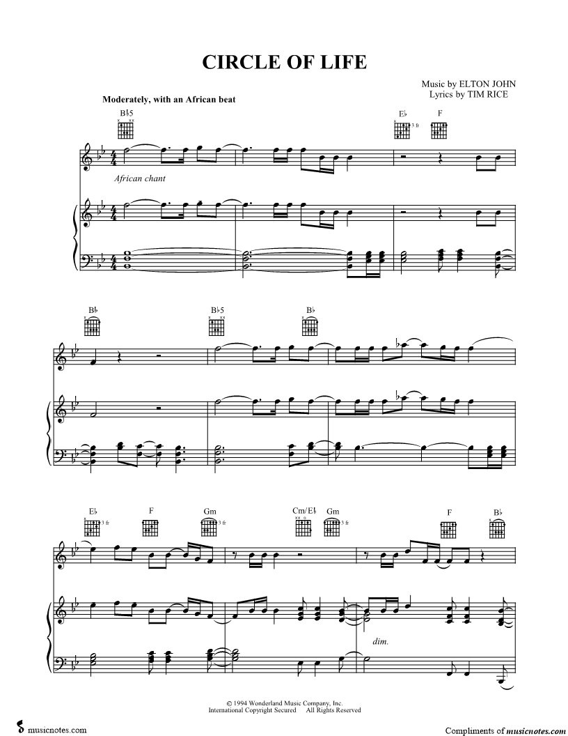1. Circle of Life (click here to preview and play this piece) Performer: Composer: Lyricist: Scored For:Piano/Vocal/Guitar Instruments:Voice, range: C4-Bb5, Piano and Guitar Number of pages:8 Click here to purchase this piece separately for $5.99 |