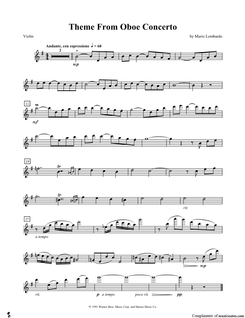 1. Theme From Oboe Concerto (click here to preview and play this piece) Composer: Scored For:Instrumental Solo Instrument:Violin, range: D4-A6 Number of pages:1 Click here to purchase this piece separately for $4.99 |