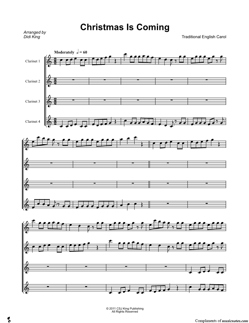 1. Christmas Is Coming - Clarinet Quartet (Score) (click here to preview and play this piece) Composer: Lyricist: Scored For:Clarinet Choir, Instrumental Quartet and Score Instruments:Clarinet 1, range: C5-C6, Clarinet 2, range: C5-C6, Clarinet 3, range: C4-C5 and Clarinet 4, range: C4-C5 Number of pages:2 Click here to purchase this piece separately for $4.99 |