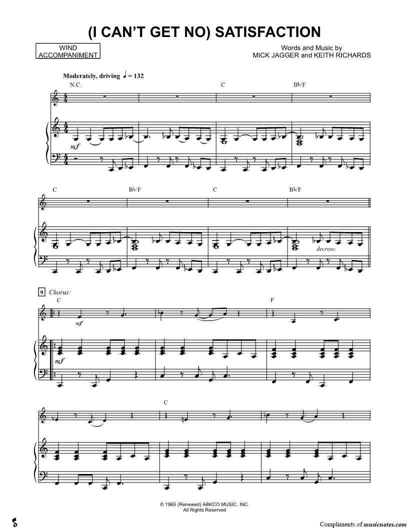 1. (I Can't Get No) Satisfaction - Piano Accompaniment (Winds) (click here to preview and play this piece) Performer: Composers: Lyricists: Scored For:Instrumental Part and Solo & Accompaniment Instruments:Piano Accompaniment, C Instrument, Violin, Oboe, Flute and Recorder Number of pages:4 Click here to purchase this piece separately for $5.99 |