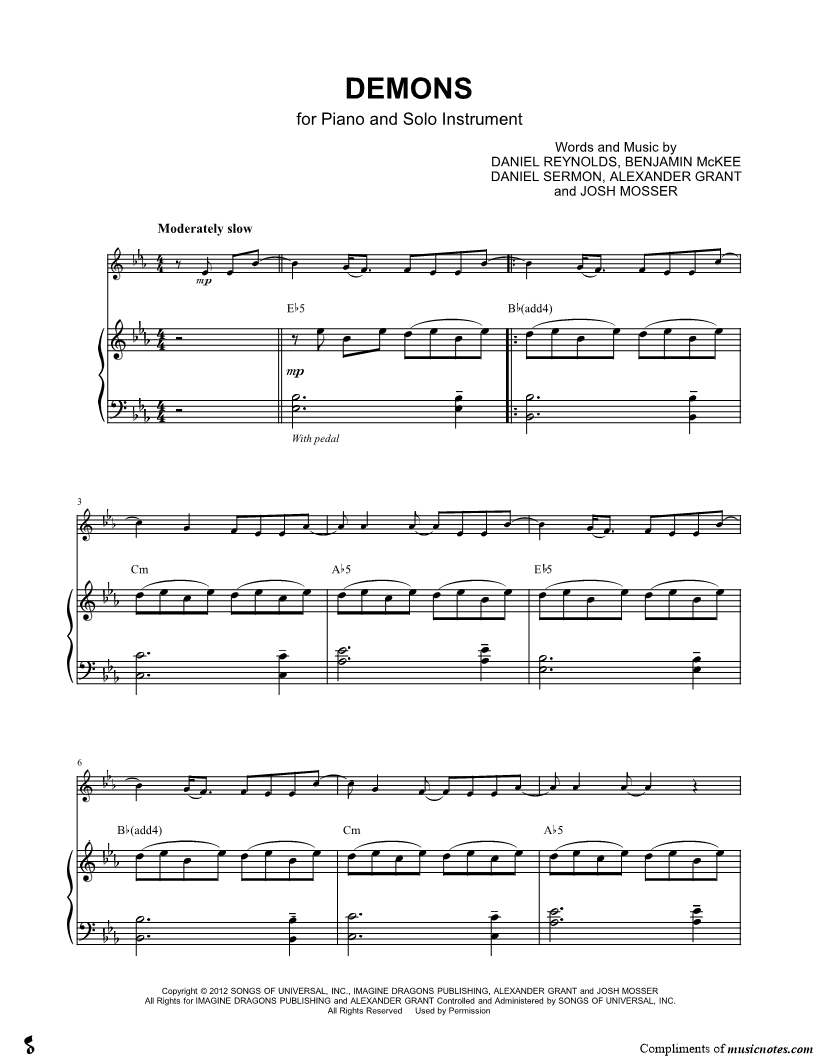 1. Demons - Piano Accompaniment (click here to preview and play this piece) Performer: Composers: Lyricists: Scored For:Solo & Accompaniment and Instrumental Part Instruments:Piano Accompaniment, C Instrument, range: Eb4-Bb5, Violin, Oboe, Flute and Recorder Number of pages:5 Click here to purchase this piece separately for $5.99 |