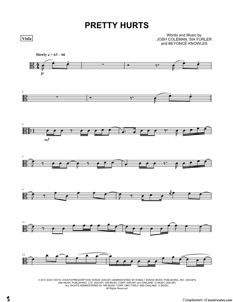 1. Pretty Hurts - Viola (click here to preview and play this piece) Performer: Composers: Lyricists: Scored For:Instrumental Solo and Instrumental Part Instrument:Viola, range: G3-E5 Number of pages:3 Click here to purchase this piece separately for $4.99 |