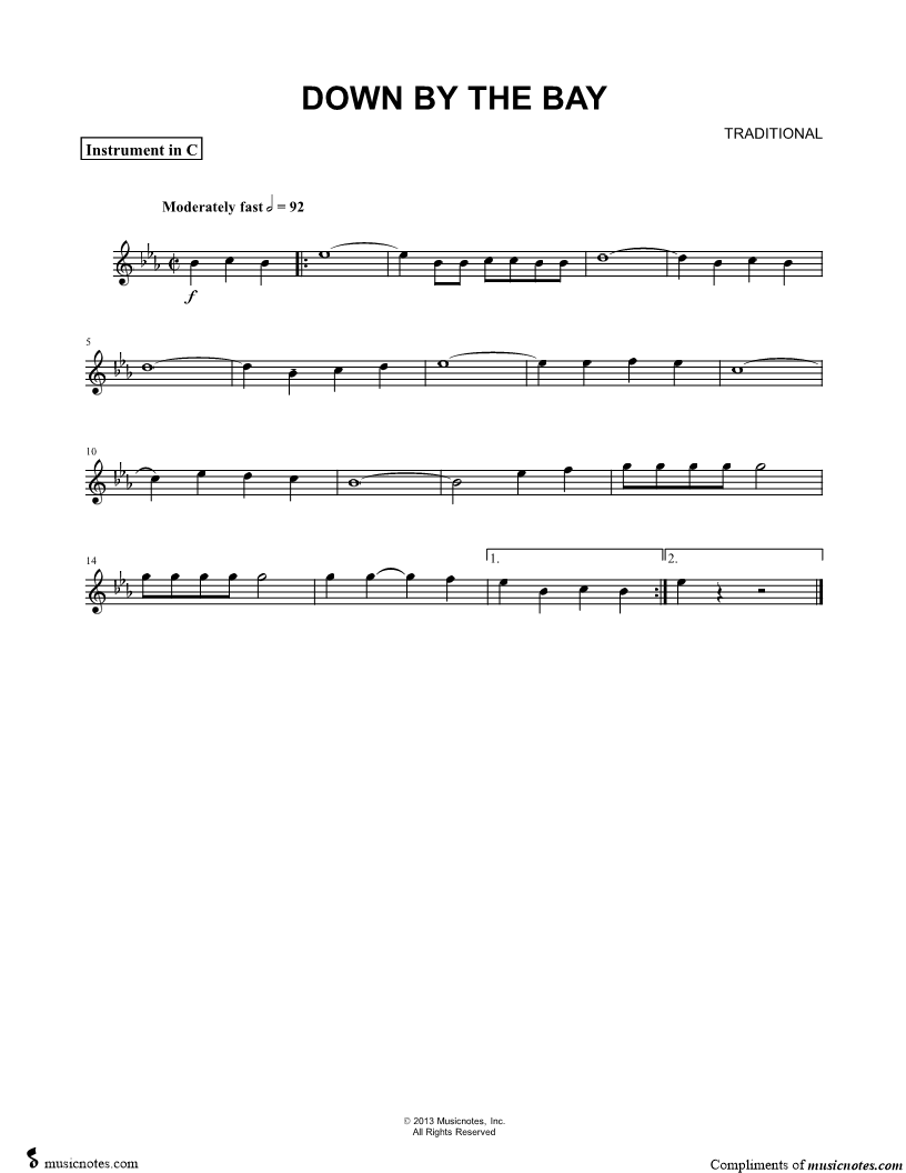 1. Down by the Bay - C Instrument (click here to preview and play this piece) Performer: Composer: Lyricist: Scored For:Instrumental Solo Instruments:C Instrument, range: Bb4-G5, Violin, Oboe, Flute and Recorder Number of pages:1 Click here to purchase this piece separately for $4.99 |