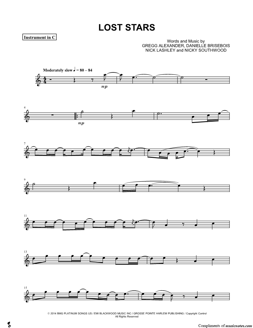 1. Lost Stars - C Instrument (click here to preview and play this piece) Performers: Composers: Lyricists: Scored For:Instrumental Part and Instrumental Solo Instruments:C Instrument, range: C4-A5, Flute, Oboe, Recorder and Violin Number of pages:3 Click here to purchase this piece separately for $4.99 |