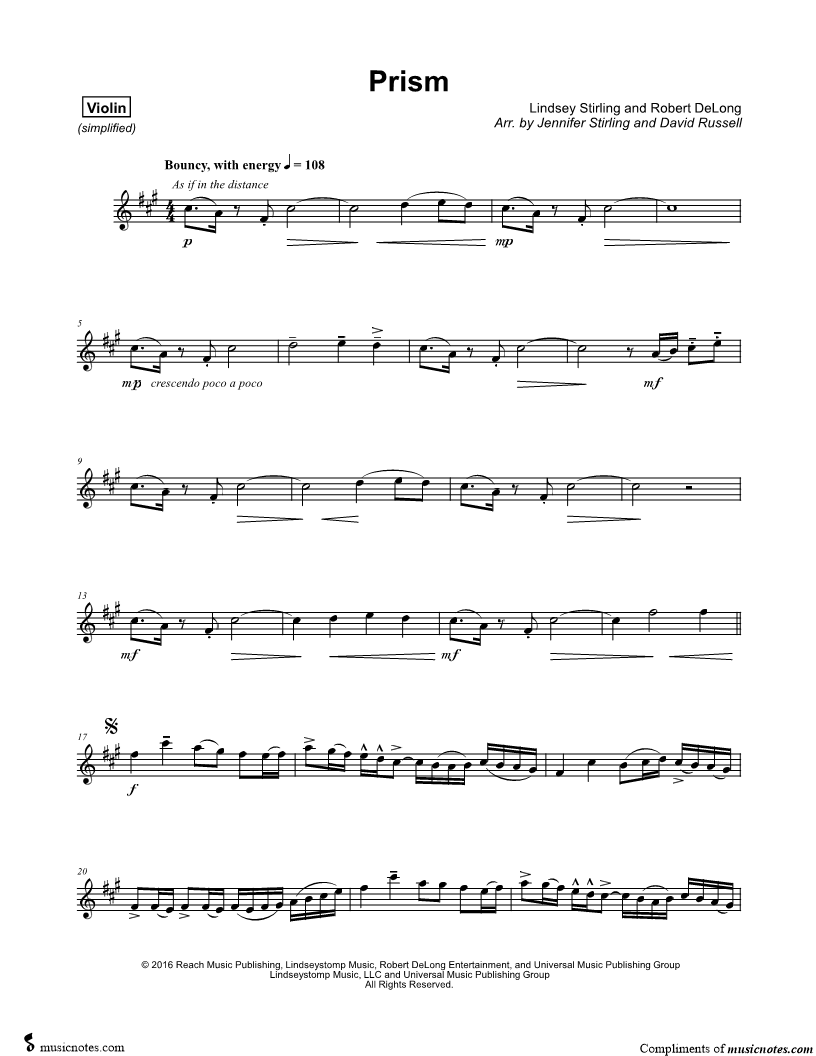 1. Prism - Violin Part [Simplified] (click here to preview and play this piece) Performer: Composers: Scored For:Instrumental Solo and Instrumental Part Instrument:Violin, range: E4-E6 Number of pages:3 Click here to purchase this piece separately for $5.99 |