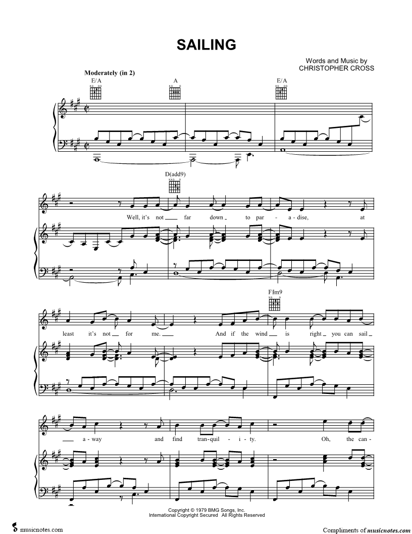 1. Sailing (click here to preview and play this piece) Performer: Composer: Lyricist: Scored For:Piano/Vocal/Guitar Instruments:Voice, range: E4-E5, Piano and Guitar Number of pages:7 Click here to purchase this piece separately for $5.99 |