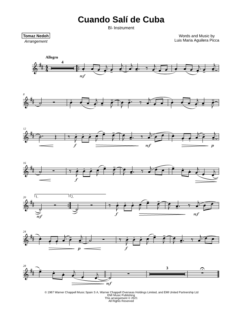 1. Cuando Salí de Cuba - Bb Instrument (click here to preview and play this piece) Performers: Composer: Lyricist: Scored For:Instrumental Solo and Instrumental Part Instruments:Bb Instrument, range: D4-E5, Trumpet, Soprano Saxophone, Tenor Saxophone and Clarinet Number of pages:1 Click here to purchase this piece separately for $2.99 |