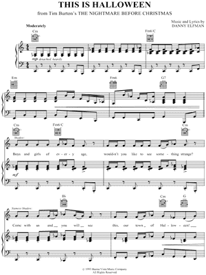 1. This Is Halloween (click here to preview and play this piece) Composer: Lyricist: Scored For:Piano/Vocal/Guitar Instruments:Voice, range: F#3-Eb5, Piano and Guitar Number of pages:8 Click here to purchase this piece separately for $5.99 |