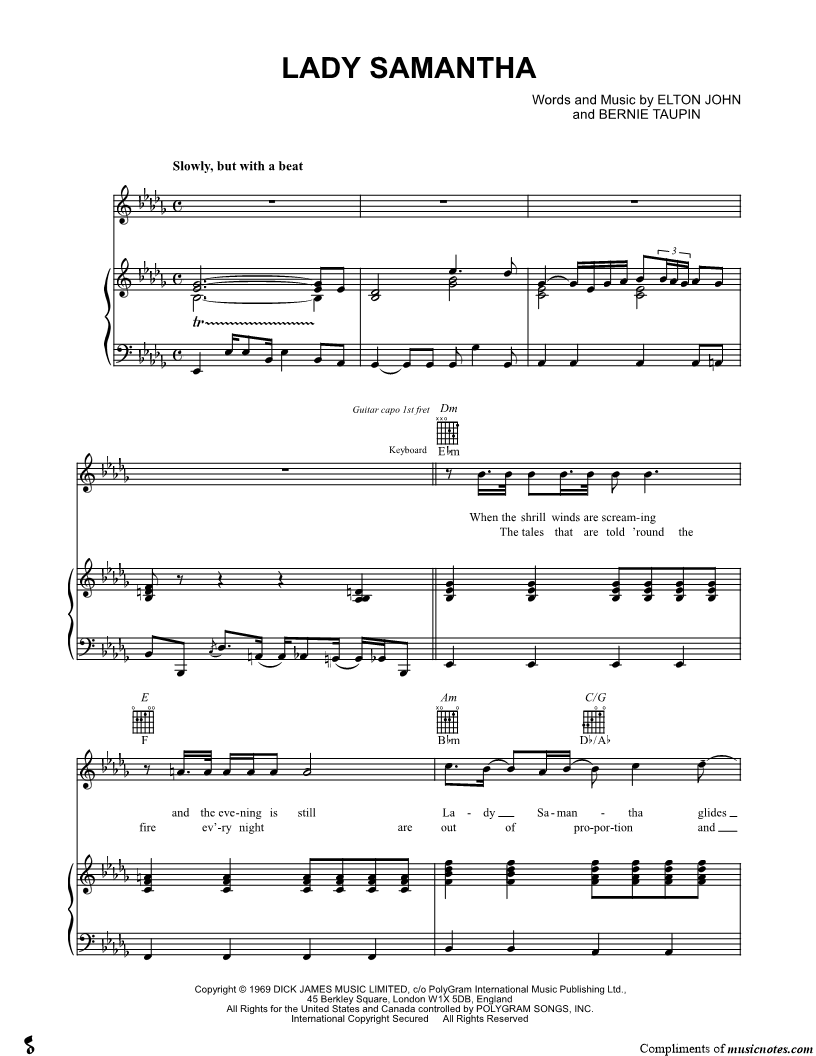 When the shrill winds are screaming the evening is still Lady Samantha glides over the hill in a long satin dress that she wears ev'ry day. |