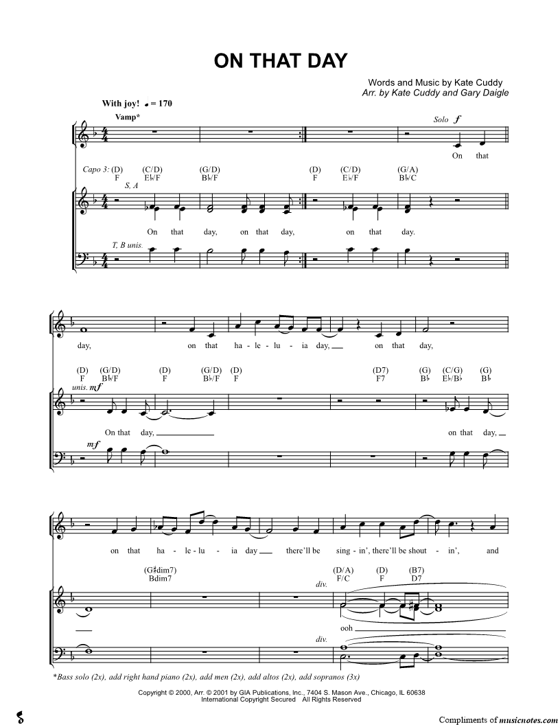On that day, on that haleluia day, on that day, on that haleluia day there'll be singin', there'll be shoutin', and joy flows like a fountain on that day. |