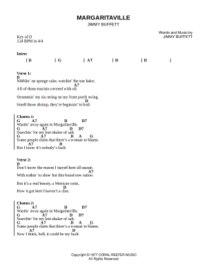 Lyrics begin: "Nibblin' on spongecake, watchin' the sun bake; all of those tourists covered with oil."