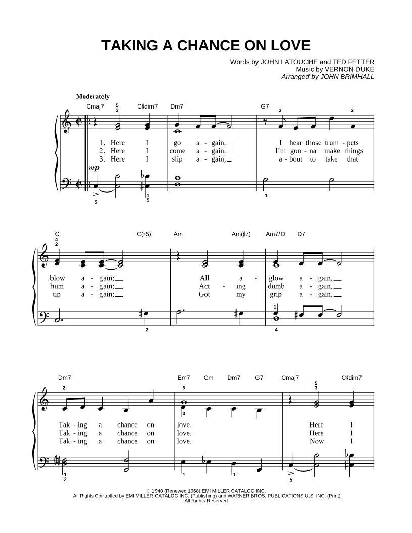 Here I go again, I hear those trumpets blow again; All aglow again, Taking a chance on love. |