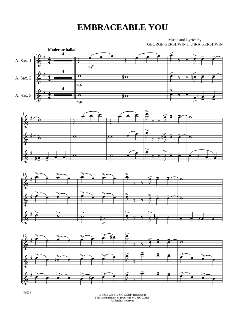 Alto Saxophone 1, range: E4-Eb6 Alto Saxophone 2, range: C5-C6 Alto Saxophone 3, range: F#4-A5 | |