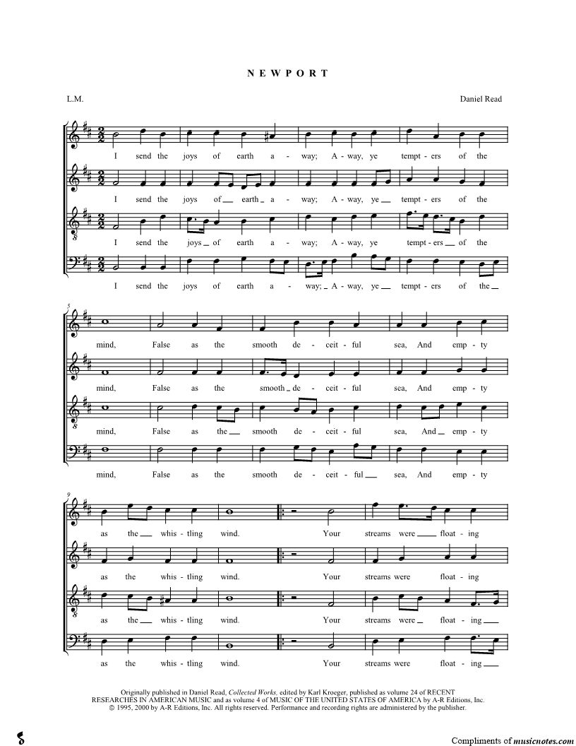 I send the joys of earth away; Away, ye tempters of the mind, False as the smooth deceitful sea, And empty as the whistling wind. |