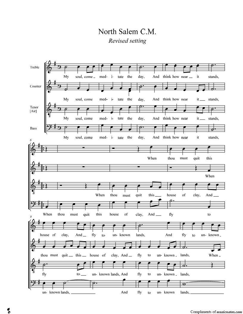 My soul, come meditate the day, And think how near it stands, When thou must quit this house of clay, And fly to unknown lands. |