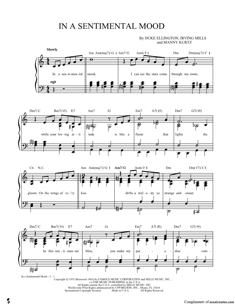 In a sentimental mood, I can see the stars come through my room, while your loving attitude is like a flame that lights the gloom. |