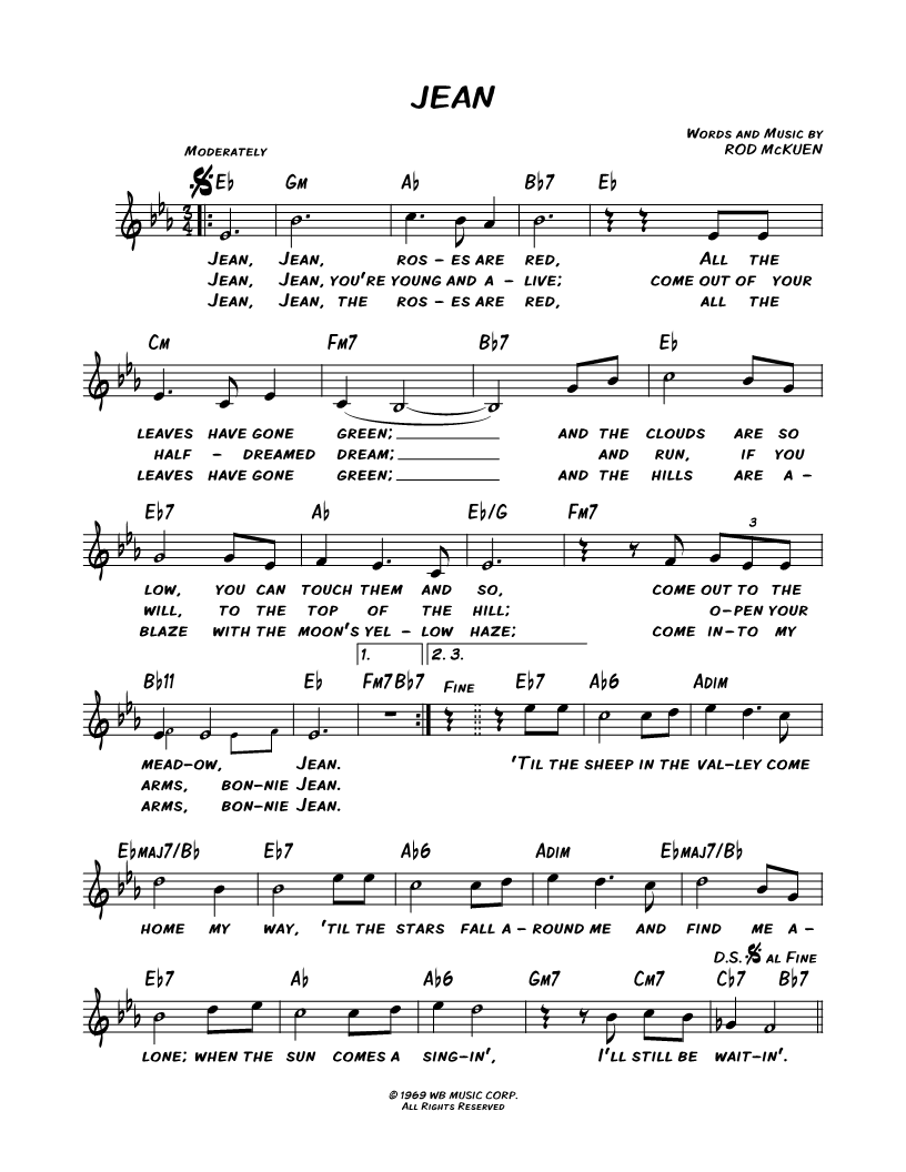 Jean, Jean, roses are red, All the leaves have gone green; and the clouds are so low, you can touch them and so, come out to the meadow, Jean. |
