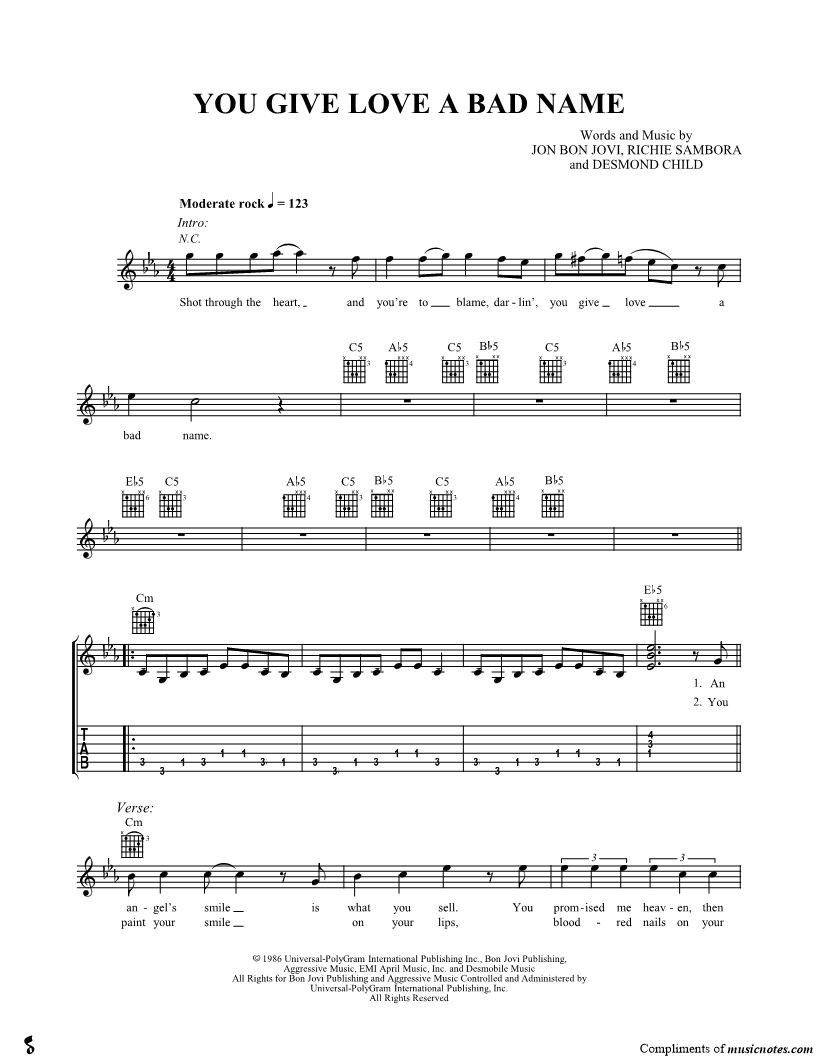 Shot through the heart, and you're to blame, darlin', you give love a bad name. |