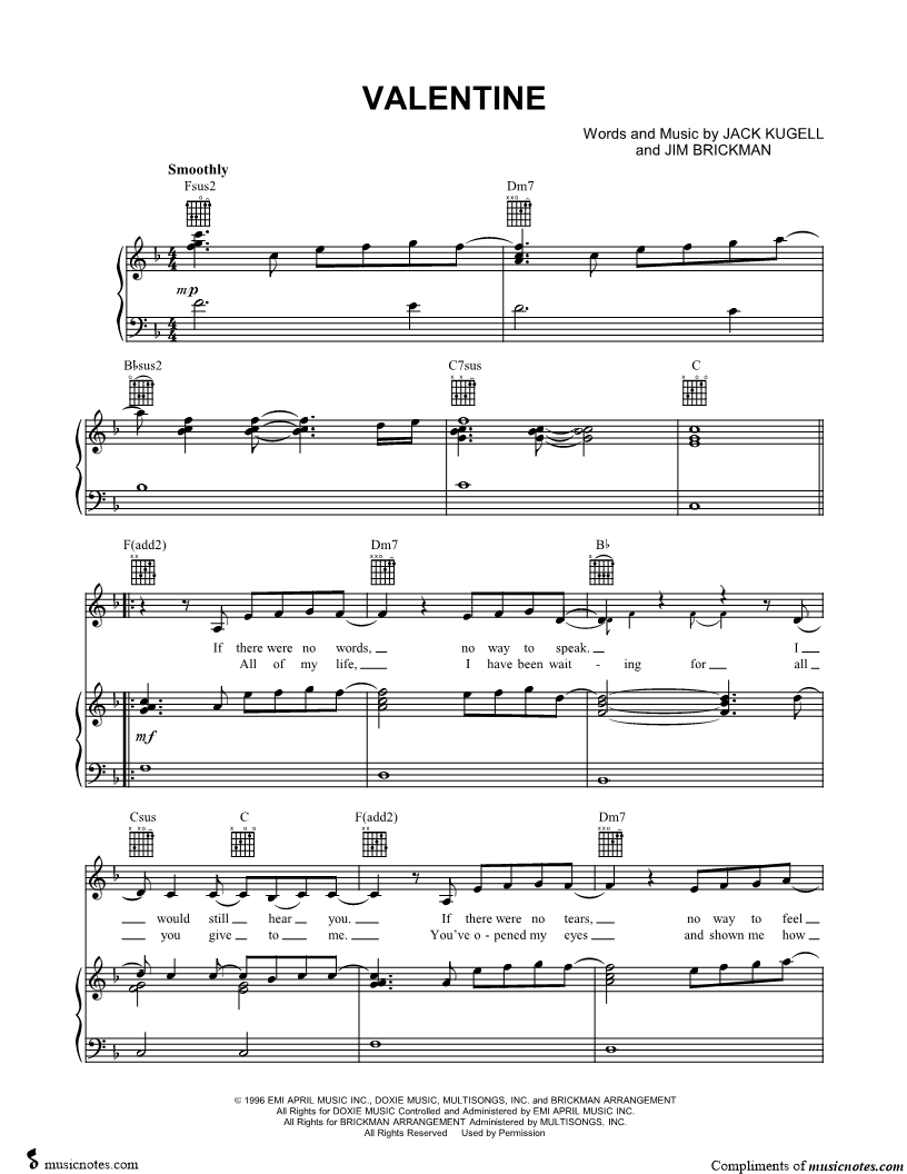 "Valentine is a love song that is versatile --- it can be sung at a Valentines Day party, a..." Read reviews