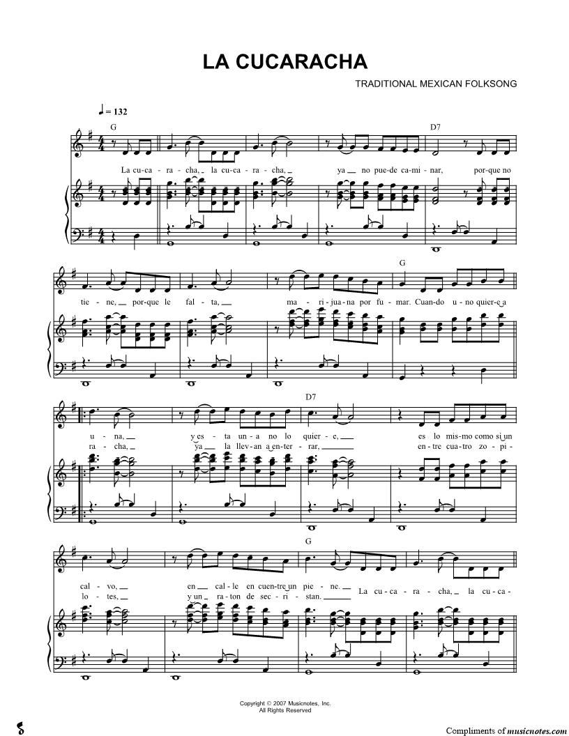 La cucaracha, la cucaracha, ya no puede caminar, porque no tiene, porque le falta, marijuana por fumar. |