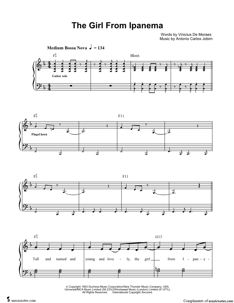 Tall and tanned and young and lovely, the girl from Ipanema goes walking and when she passes each one she passes goes, "Ah"... |