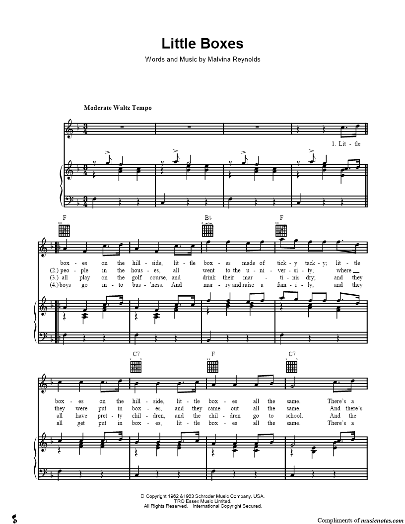 Little boxes on the hillside, little boxes made of ticky tacky; little boxes on the hillside, little boxes all the same. |