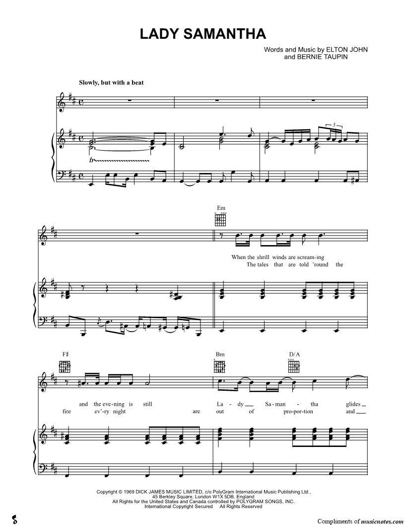 When the shrill winds are screaming the evening is still Lady Samantha glides over the hill in a long satin dress that she wears ev'ry day. |