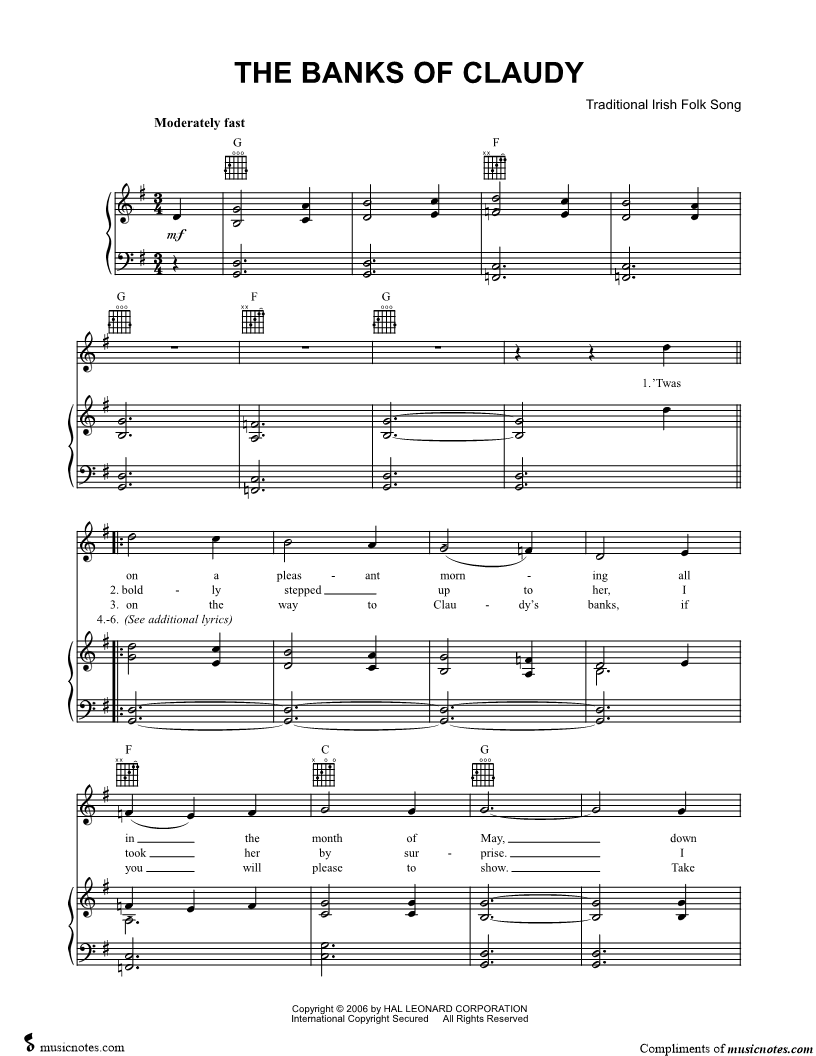 'Twas on a pleasant morning all in the month of May, down by the banks of Claudy I carelessly wound my way. |