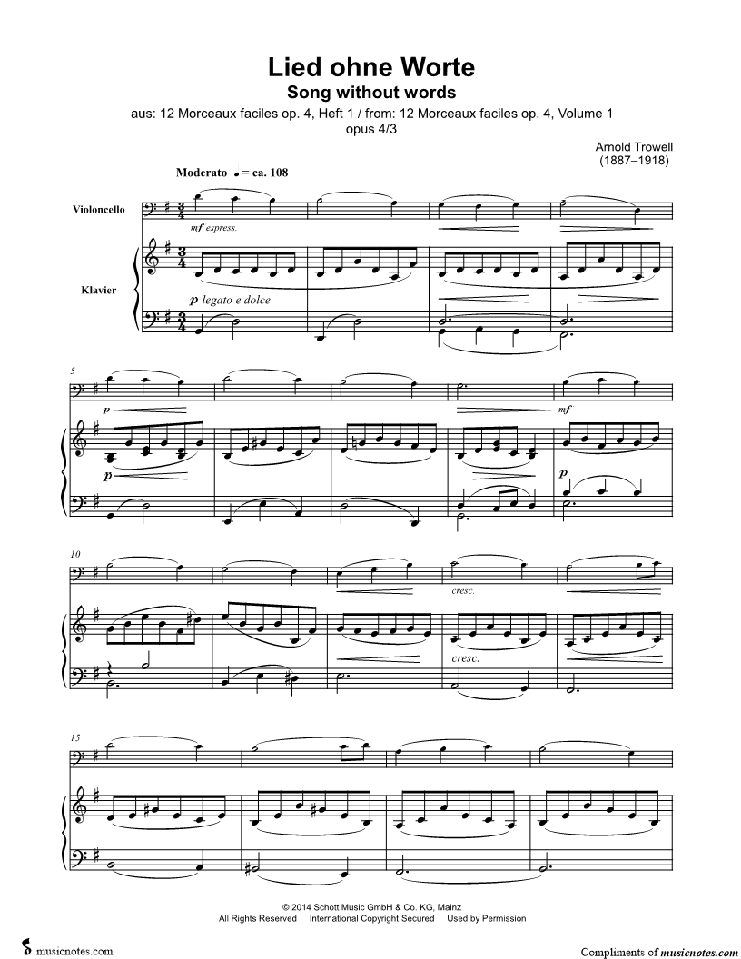 12 Morceaux faciles, Op. 4, Vol. 1: III. Chanson sans paroles - Cello & Piano |