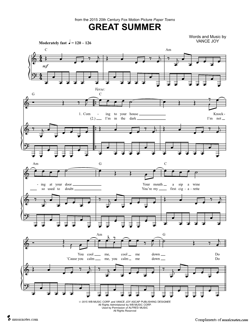 Musicnotes sells a wide variety of digital sheet music products including Singer Pros, Beginner Notes, Choral music, Piano Solos, Lead Sheets, Piano/Vocal/Guitar, Solo and Accompaniment, and fretted instrument tablature.