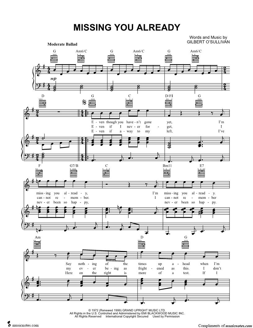 Even though you haven't gone yet, I'm missing you already, I'm missing you already. |