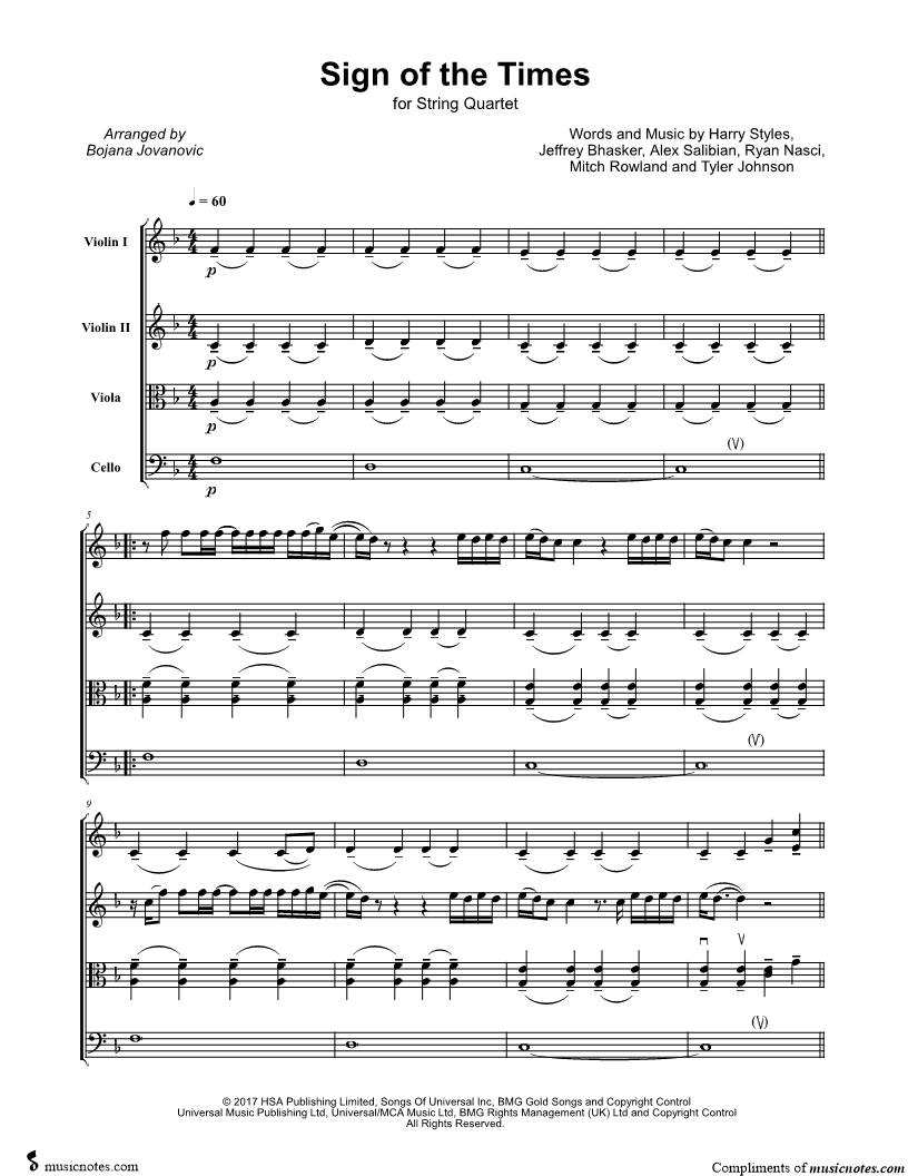 Violin 1, range: C4-C6 Violin 2, range: A3-C6 Viola, range: G3-E5 Cello, range: C2-A3 | |