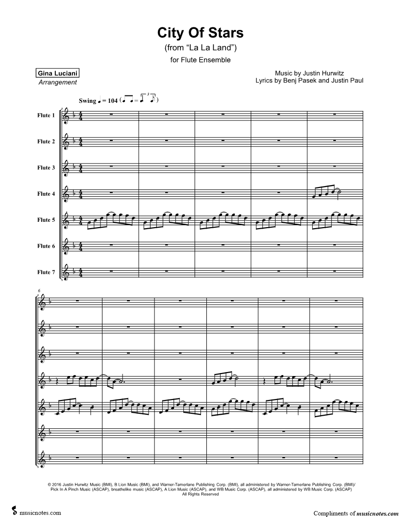 Flute 1, range: G4-A5 Flute 2, range: D4-A5 Flute 3, range: G4-F5 Flute 4, range: C4-A5 Flute 5, range: C4-G5 Flute 6, range: C4-Bb4 Flute 7 | |