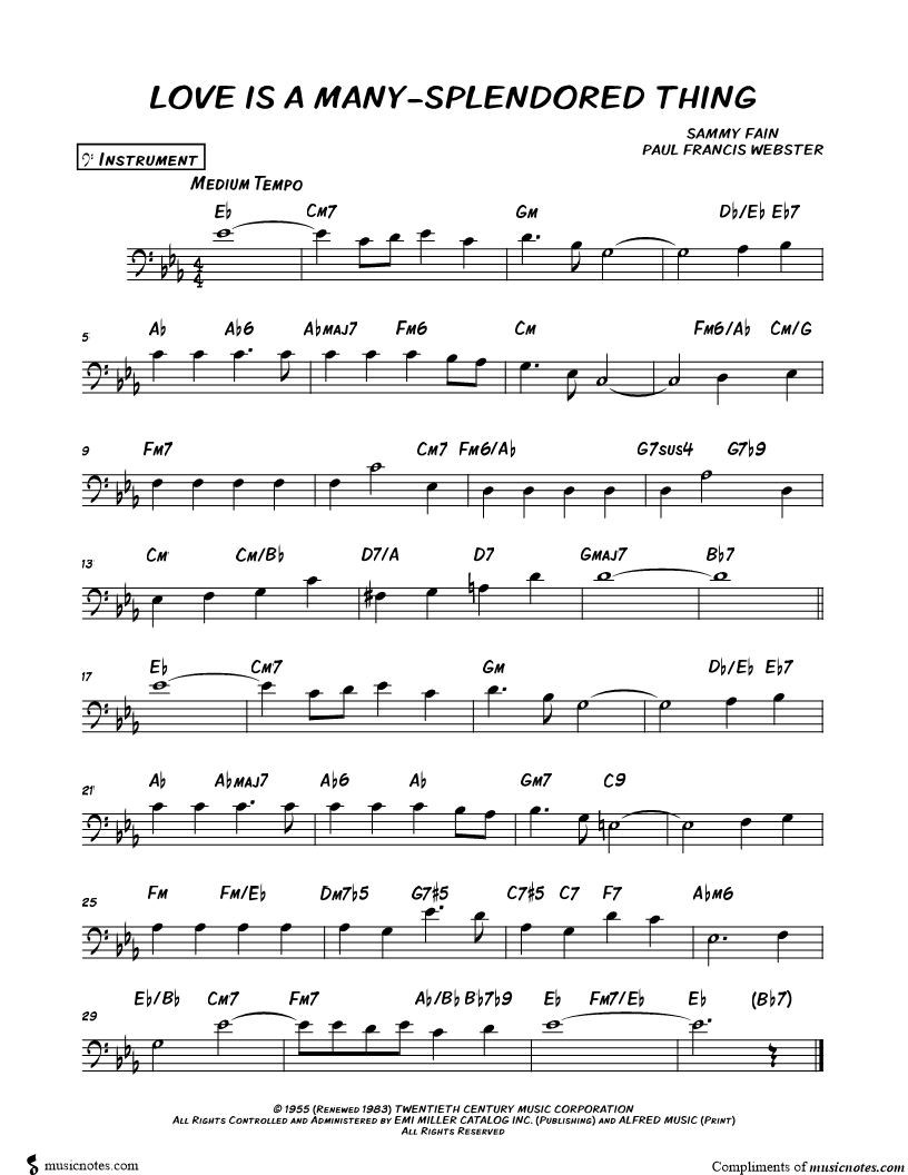 Love Is a Many-Splendored Thing - Bass Clef Instrument |
