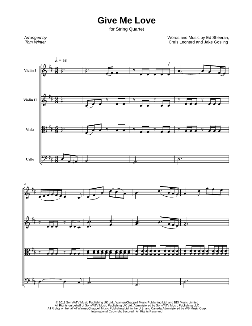Violin 1, range: B3-A5 Violin 2, range: G3-F#5 Viola, range: D3-D4 Cello, range: D2-E3 | |