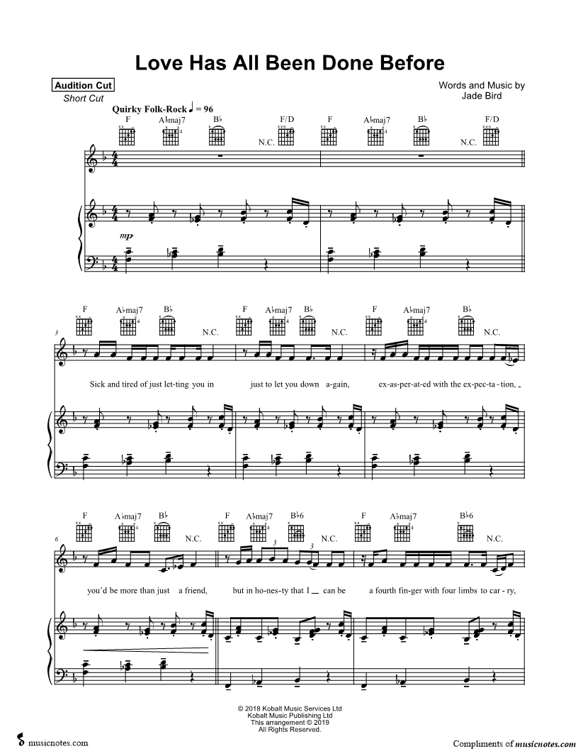 Musicnotes sells a wide variety of digital sheet music products including Singer Pros, Beginner Notes, Choral music, Piano Solos, Lead Sheets, Piano/Vocal/Guitar, Solo and Accompaniment, and fretted instrument tablature.