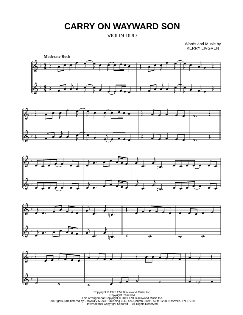 Carry On Wayward Son - Violin Duet |