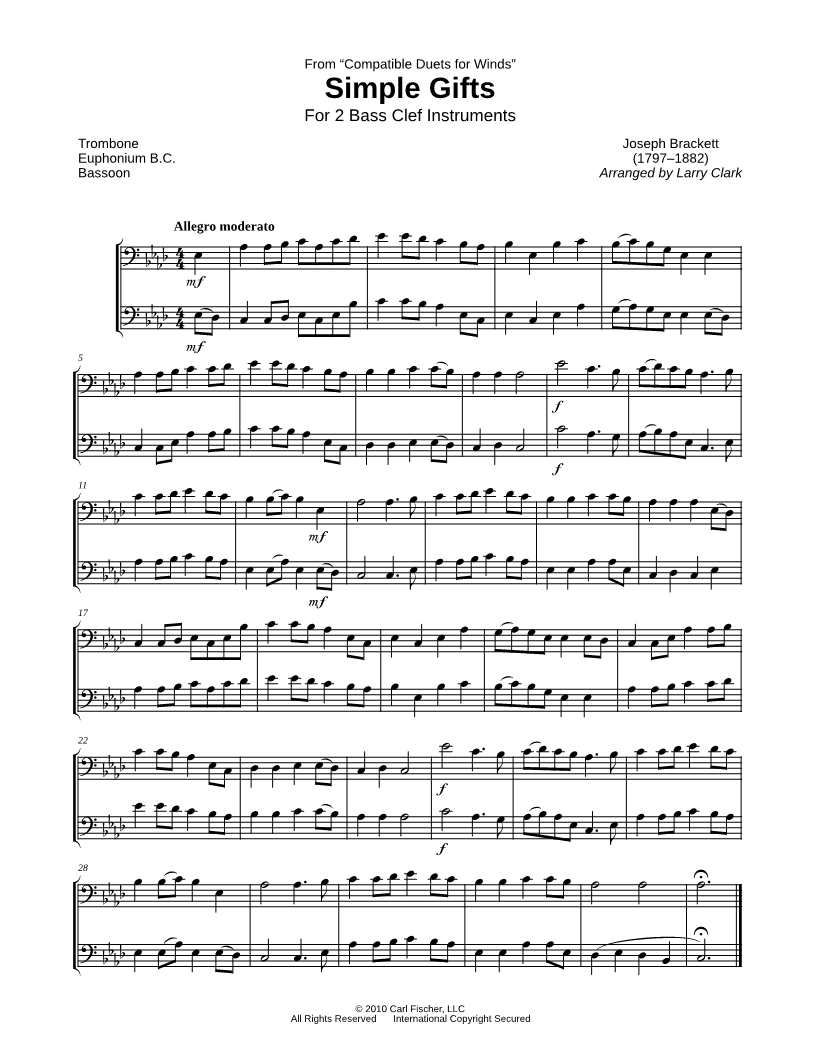 Simple Gifts - Bass Clef Instrument Duet |