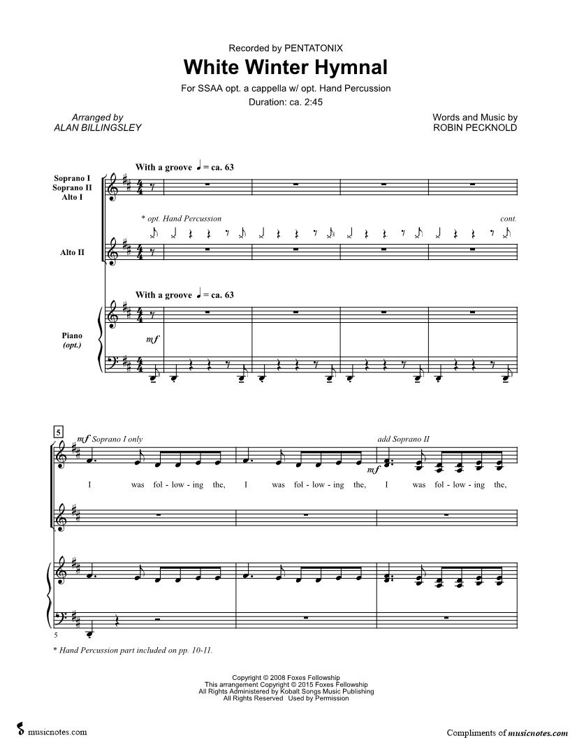 SSAA Choir, range: D3-D5 Piano Percussion | |