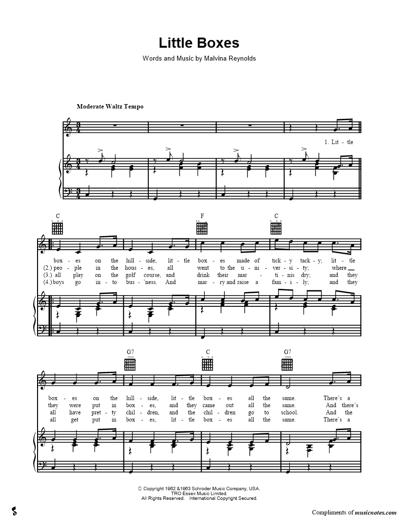 Little boxes on the hillside, little boxes made of ticky tacky; little boxes on the hillside, little boxes all the same. |