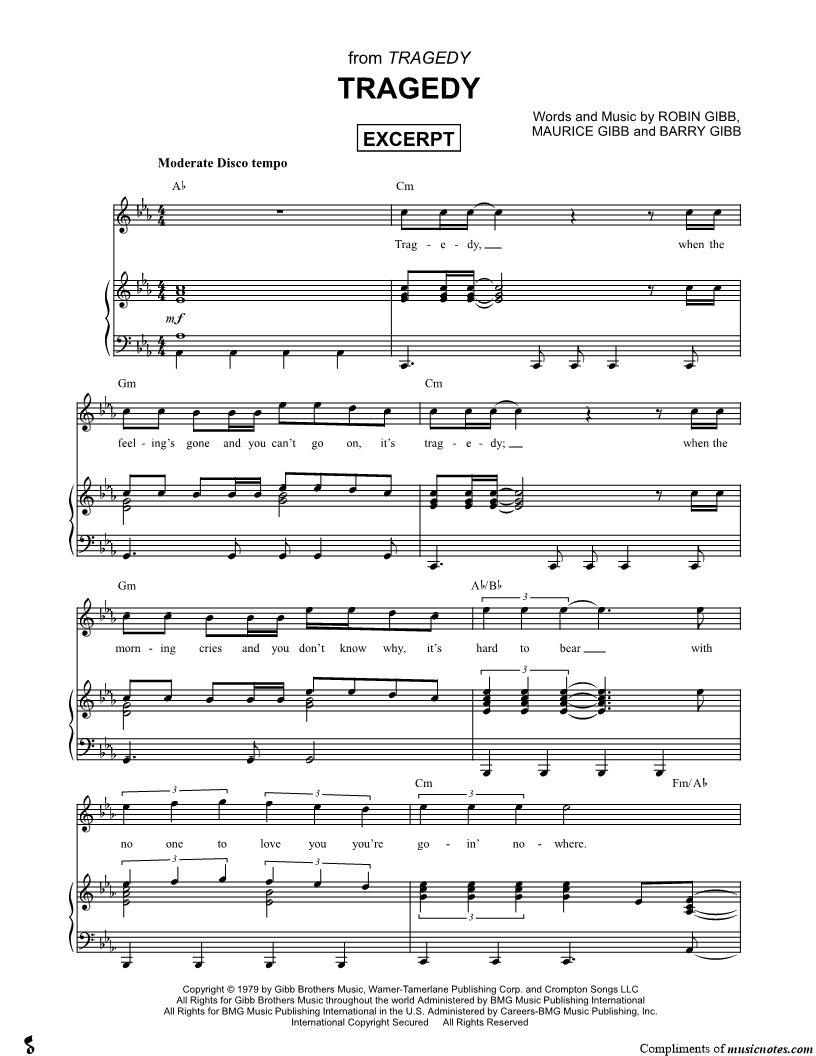 Tragedy, when the feeling's gone and you can't go on, it's tragedy; when the morning cries and you don't know why, it's hard to bear with no one to love you you're goin' nowhere. |