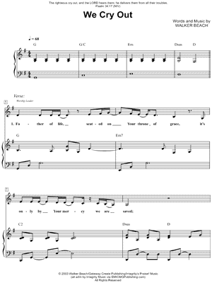 Browse our 2 arrangements of "We Cry Out." Sheet music is available for Piano, Piano Accompaniment, SATB Choir and 4 others with 3 scorings in 5 genres. Find your perfect arrangement and access a variety of transpositions so you can print and play instantly, anywhere.